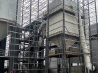 原料自原料倉經(jīng)計(jì)量電子秤進(jìn)入到NSE380 板鏈提升機(jī)垂直運(yùn)輸?shù)街粕皹亲罡唿c(diǎn),經(jīng)溜槽進(jìn)入到制砂機(jī)破碎,經(jīng)過封閉溜槽進(jìn)入到高頻篩進(jìn)行篩分 在這里一部分超標(biāo)品進(jìn)入到單傳動(dòng)輥壓機(jī)碾壓后返回提升機(jī)進(jìn)入破碎循環(huán),篩下的成品靠自重進(jìn)入到AVC3000選粉機(jī)中,合格的顆粒經(jīng)加濕拌合機(jī)進(jìn)入成品庫,超標(biāo)粉塵經(jīng)粗細(xì)粉分離機(jī)進(jìn)入到布袋收塵器,在這里大于0.075的粗顆粒返回到成品砂中,小于0.075mm的粉塵進(jìn)入到鋼板倉中儲(chǔ)存起來外運(yùn)。